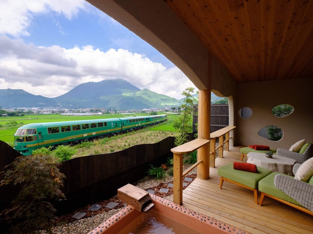 部屋からは活火山由布岳の壮大な景色を一望でき、どの部屋からも田園を駆け巡るJRの電車を眺められます。