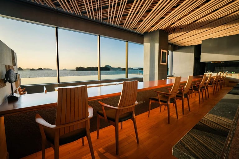 昼は光が差し込むラウンジで海を眺め、夜はしっとりとしたバー空間でゆったりと過ごす。時間帯で表情を変える建築デザインもまた印象的です。