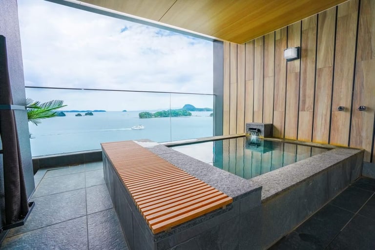 広がる海原と多島美を見渡すテラス付き客室は、すべてに露天風呂があります。湯に浸かりながら、刻々と表情を変える空と海の景色を眺める時間は、まさに“天空の名”にふさわしい贅沢さ。