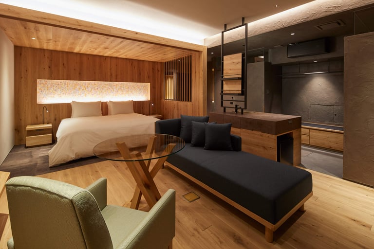客室ははいずれもテラス付きで、日本の素材感を活かした上質な和モダンのゆとりのある空間。