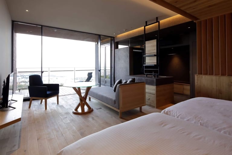 客室ははいずれもテラス付きで、日本の素材感を活かした上質な和モダンのゆとりのある空間。室内は静かでベッドはふかふか、バスルームは使い勝手がよく、テラスのソファに身を沈めれば、別府の景色を時の移ろいとともに楽しめます。
