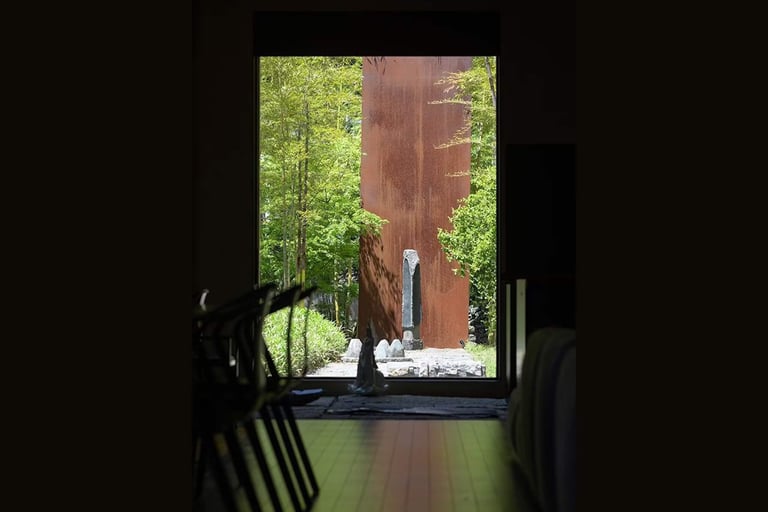 大きな窓からは木々が揺れる庭と彫刻の景色が広がり、どこにいても自然とアートが溶け合う空気に包まれます。