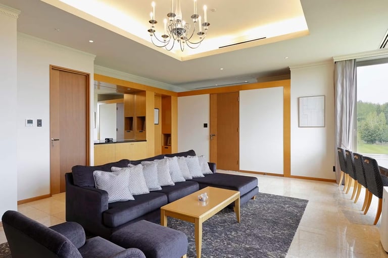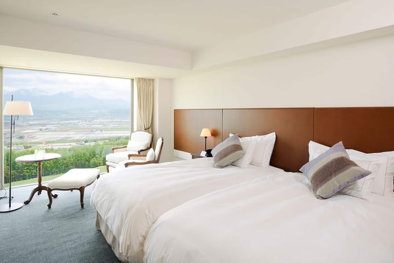 客室は全室シモンズ製ベッドを採用し、スタンダードからスイートまで様々。なかでも110㎡のスイートルームは、2ベッドルームと広々したLDKを備え、窓の向こうに十勝連山を望む開放感に満ちています。