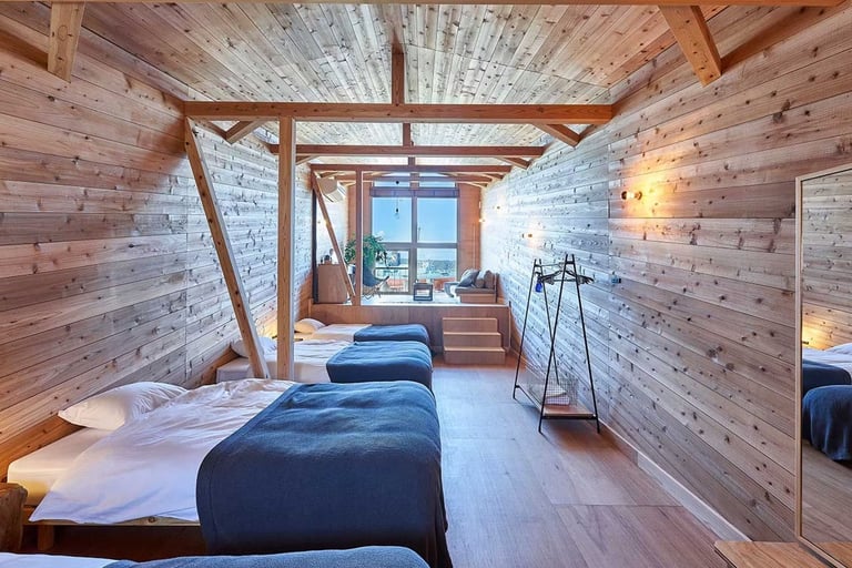 海に浮かぶ船をモチーフにした「Kujira」「Yu-hi」「Mori」「Nami」「Kumo」の5棟があり、株式会社アクタスがセレクトした家具で彩られたおしゃれな空間が魅力。