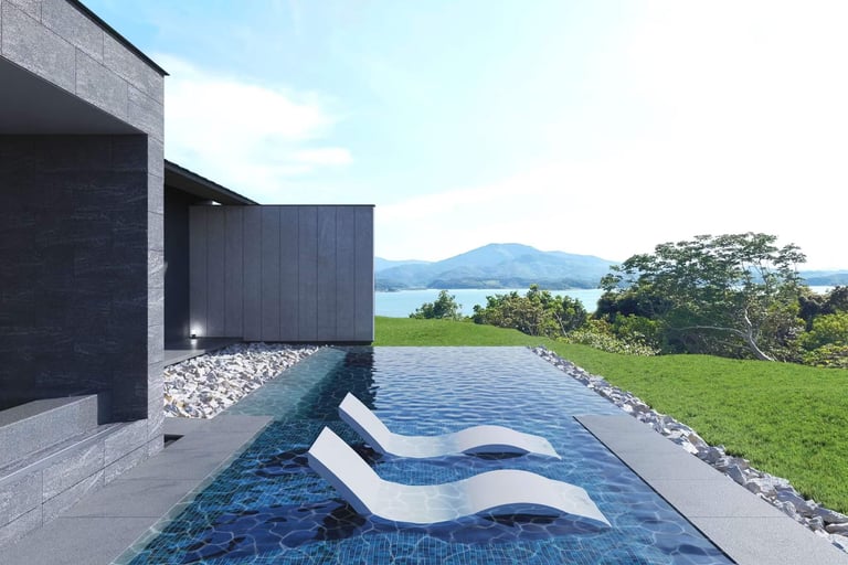 全室に源泉かけ流しの温泉を備え、プールやサウナを備えるヴィラも。静けさに包まれた空間で、お湯に身を委ねるひとときは、極上の時間。