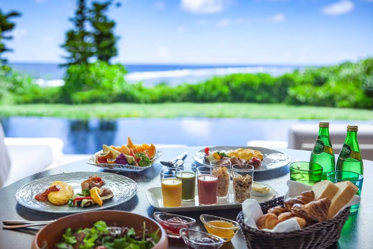 食事は、和・洋・中・イタリアン・沖縄料理など多彩なレストランが揃い、地元の魚介や島野菜を使った料理はどれも豊かな味わいを楽しめます。