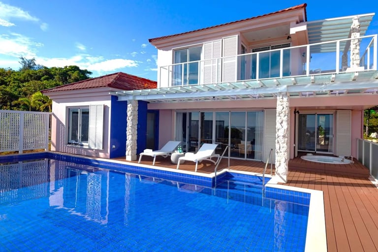 全棟に温水プライベートプールを備え、南向きの大きな窓からは“宮古ブルー”がどこまでも広がります。