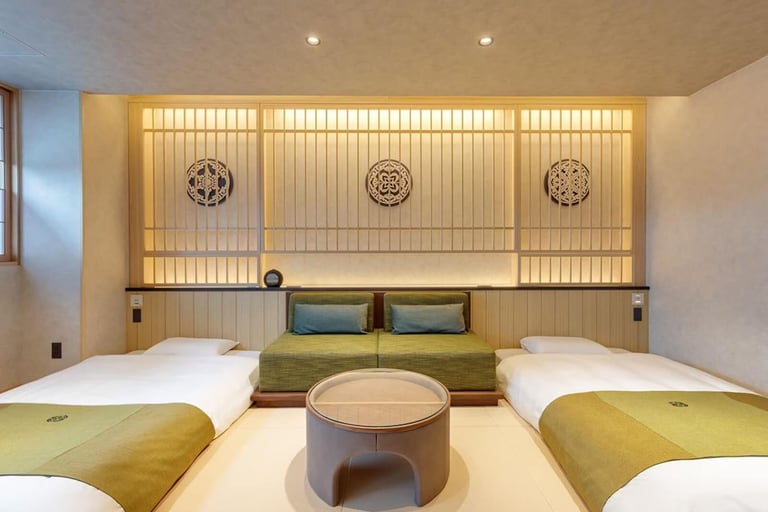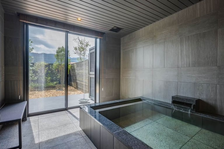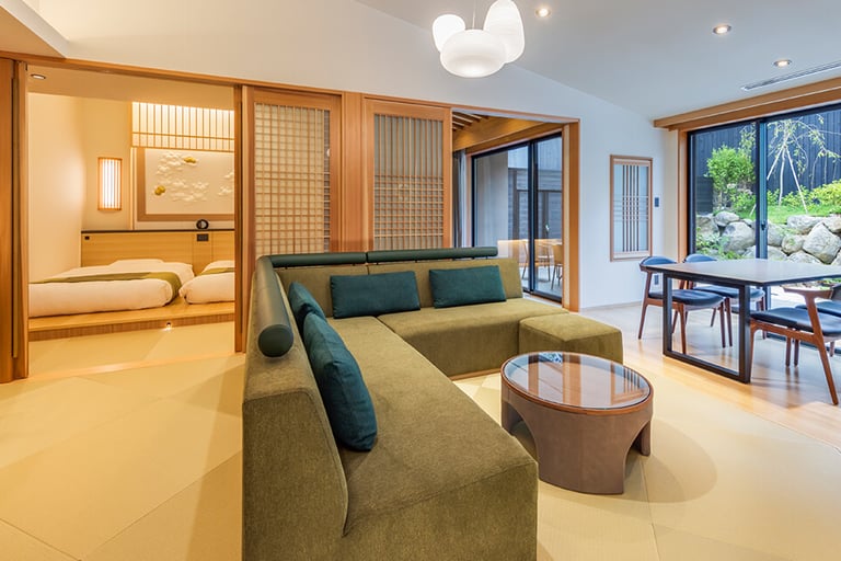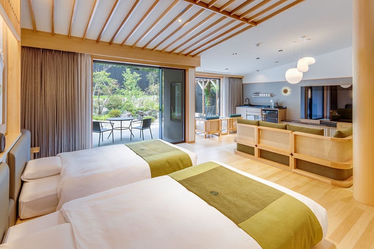 和を基調とした客室は、木の温もりと静けさに満ち、深く息をつけるような落ち着いた空間に。室内には数種類の嬉野茶と茶器も用意され、湯上がりにゆっくりとお茶を淹れて過ごすひとときには、静かな豊かさがあります。