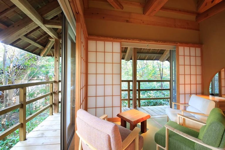 豊かな緑や渓流が望め、リスや野鳥、夏はヒグラシやカエルの声が響きわたり自然と一体となる感覚を味わえます。