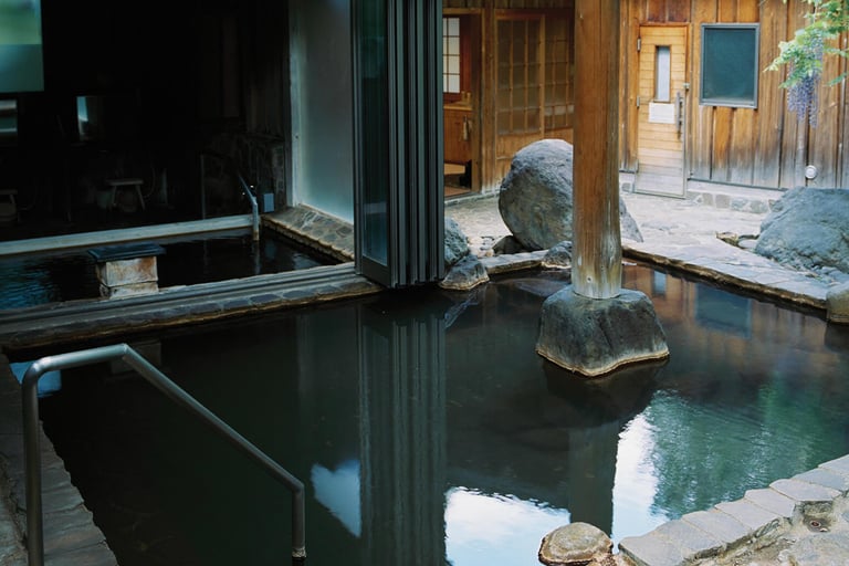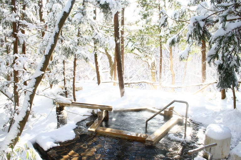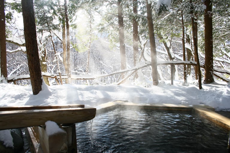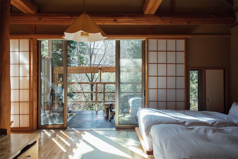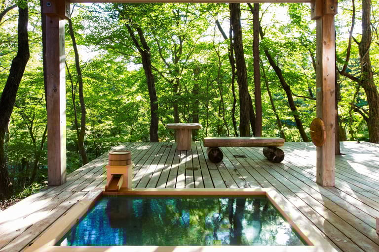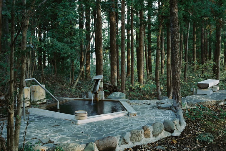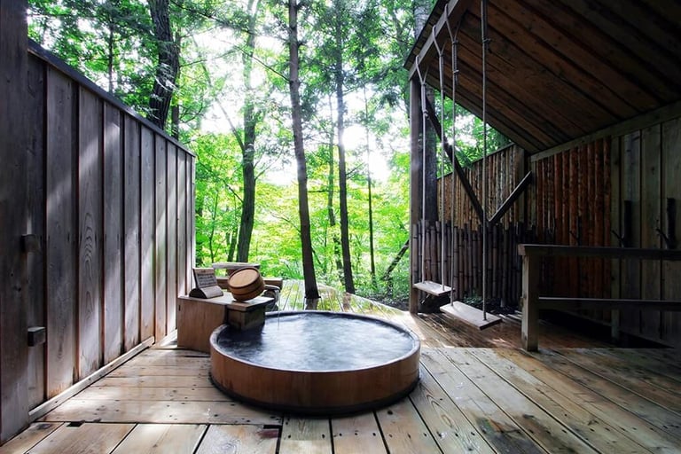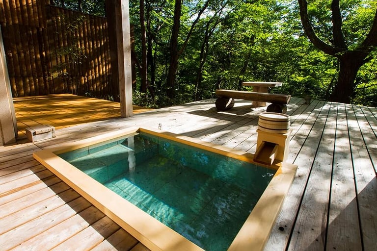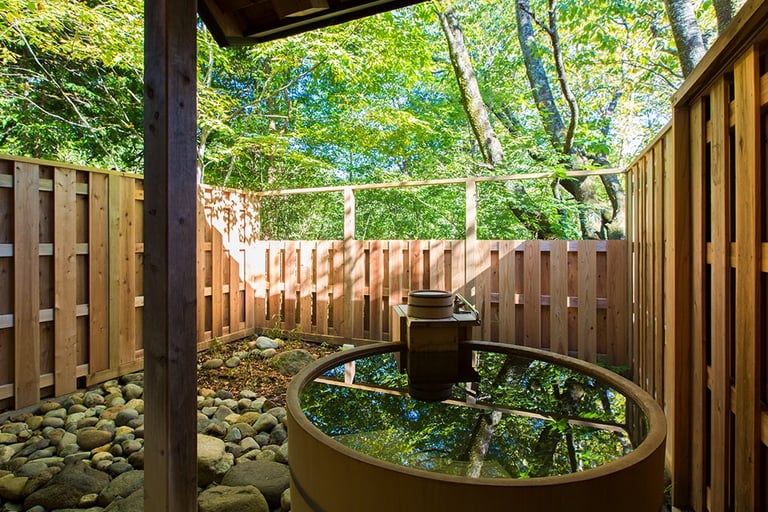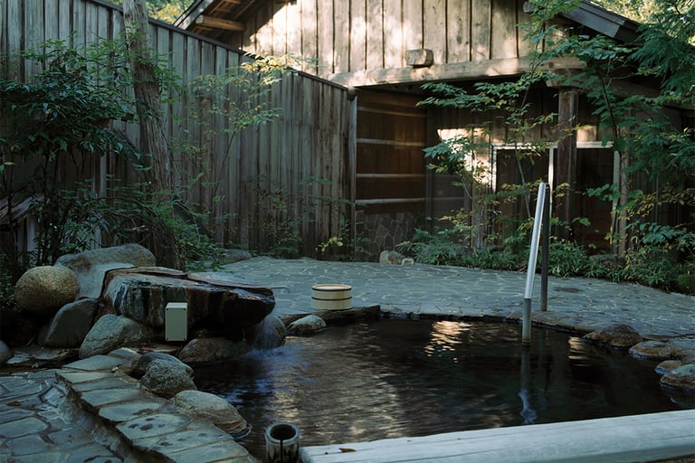 全て自家源泉かけ流しの温泉は、24時間愉しめる大風呂をはじめ、自然林が眺められる“朝かぜ“、木枕に頭をのせ満点の星空と出会える“星の林“、渓流を望む“雪待ち“、敷地の最奥に佇む秘湯“通り雨“の4種類の貸切露天風呂を用意。それぞれ趣異なる雰囲気が味わえ、疲れた心と体をリラックス。