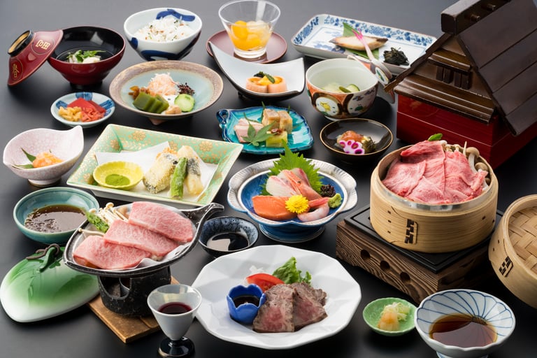 夕食は、地元の旬の素材を使用した月替わりの郷土料理会席🍽 和牛の最高峰と呼ばれる飛騨牛をはじめ、滋味深い合掌料理がいただけます。