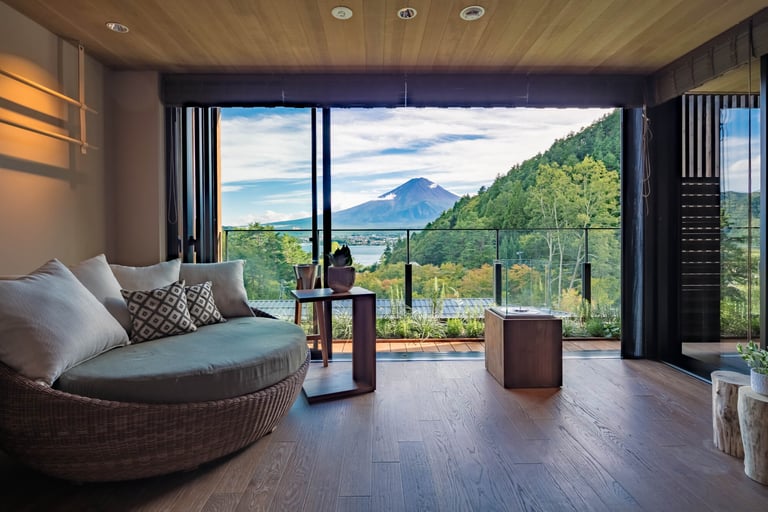 インテリアバルコニー付きや、河口湖と富士山の絶景を一望できる部屋など、豊かな自然を感じられる開放感な空間が広がります。