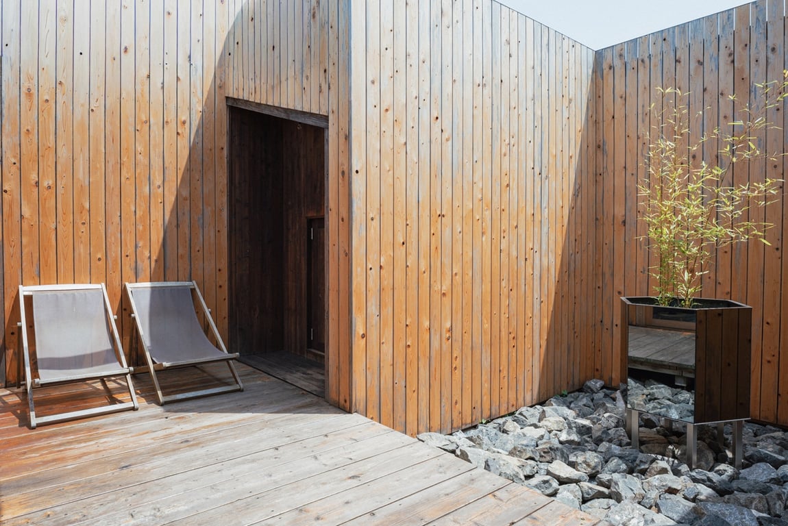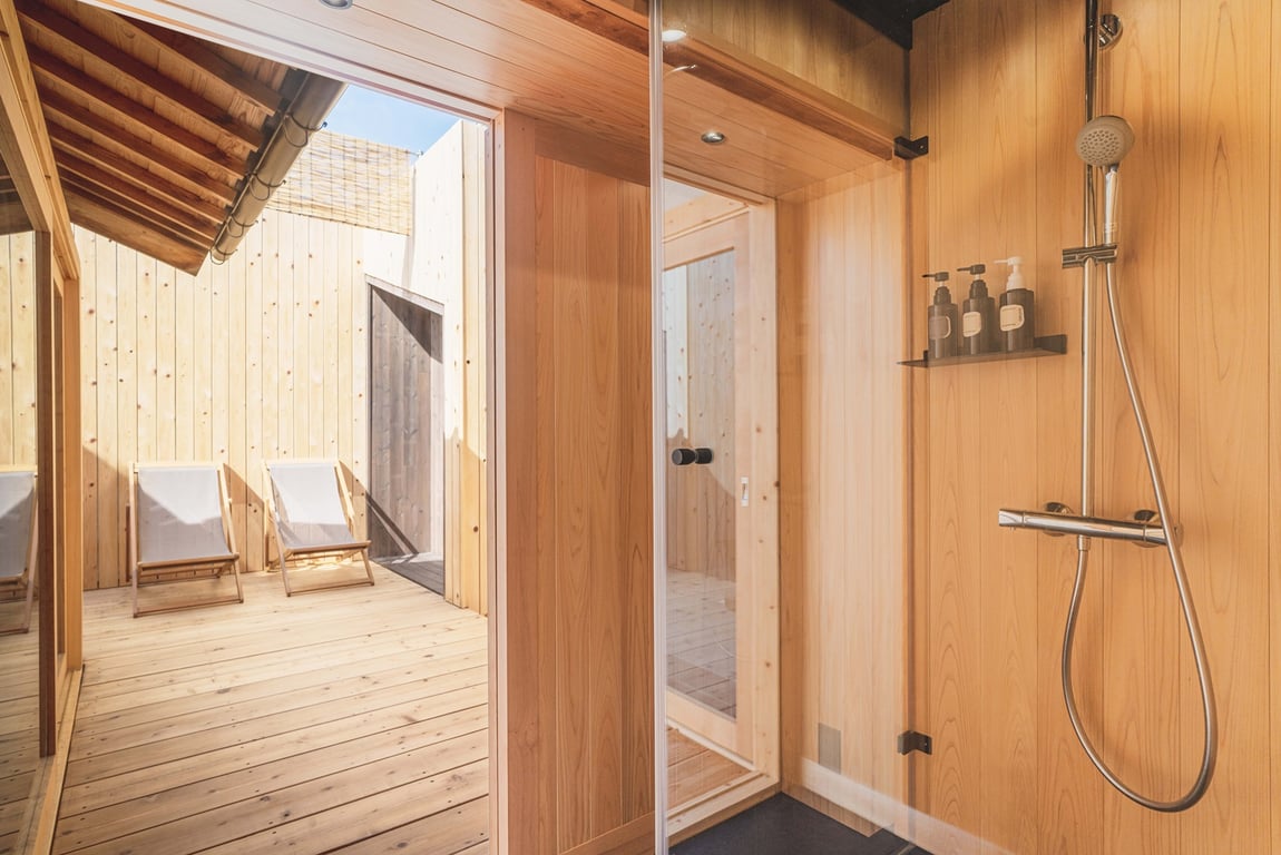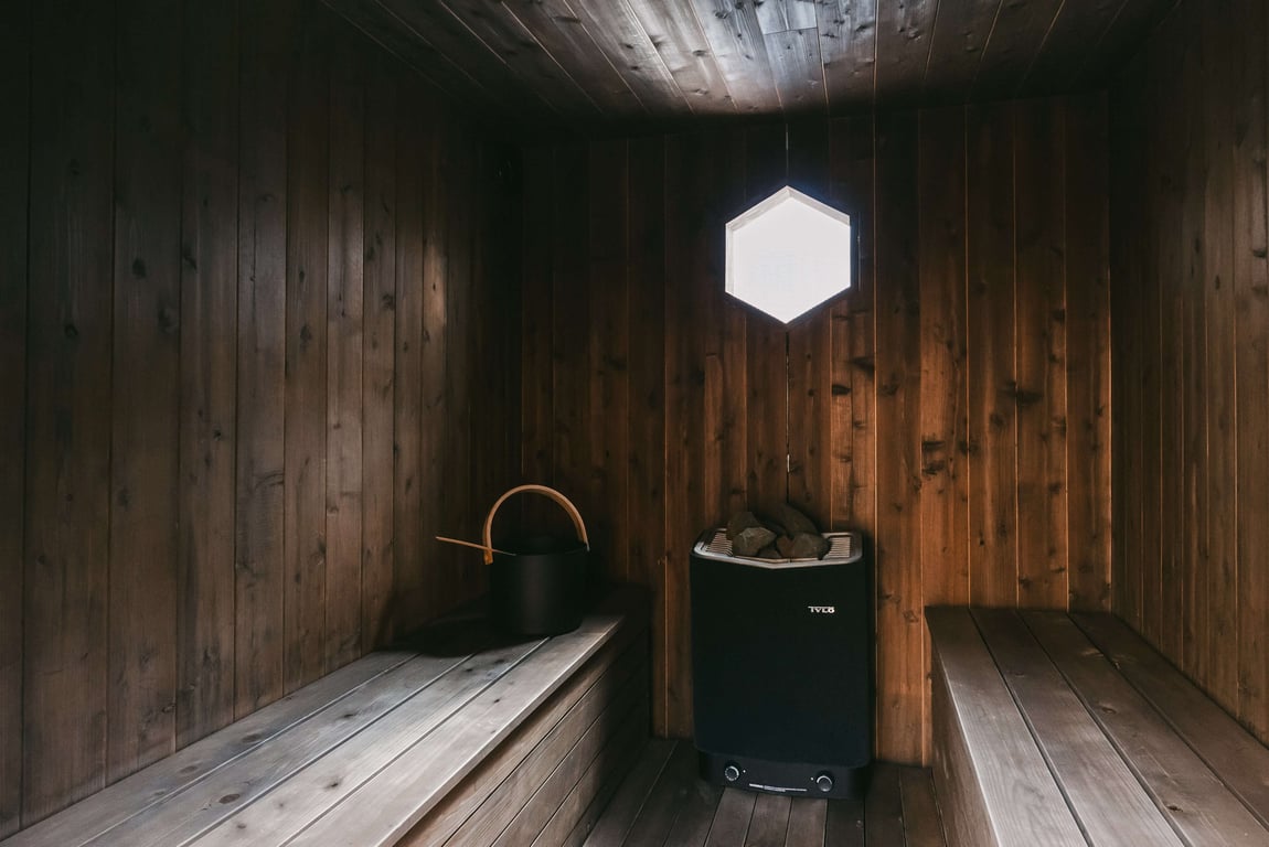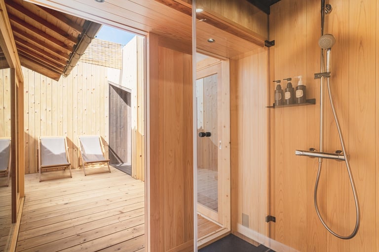 総檜造りのプライベートサウナも完備。アロマ水をかけて、セルフロウリュウも楽しめる贅沢な空間。立ちのぼる蒸気とともに、檜の香りがやさしく広がり、夜や早朝の静寂の中、誰にも邪魔されず、自分だけの時間を満喫できます。