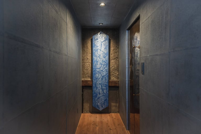 各部屋には太陽光や影を使ったアートや、日本の伝統的なモチーフをコラージュした作品などが展示。自然のぬくもりを感じる作品に包まれながら、静かに心を整えることができます。