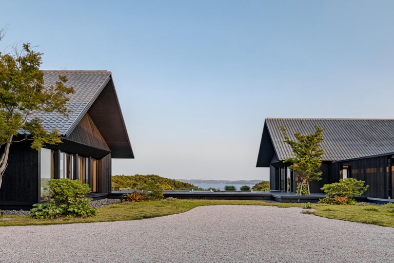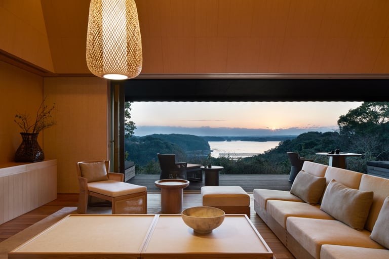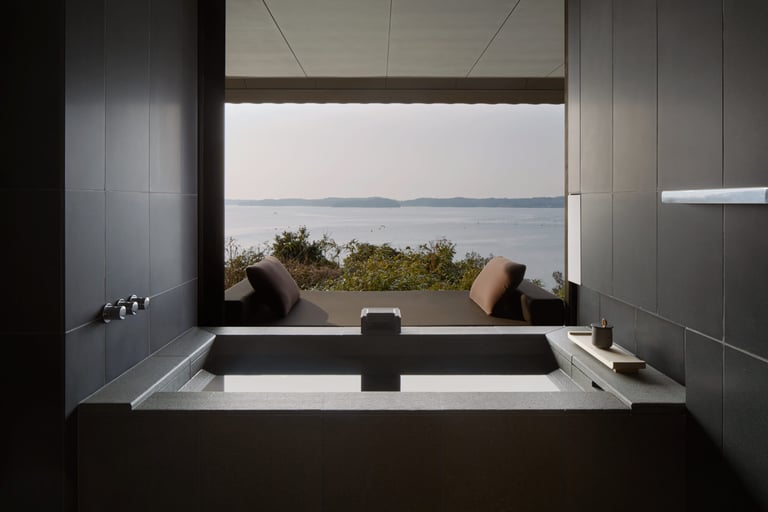スイートとヴィラの2タイプの客室は半島の高台にあり、全客室にミネラル分豊富な天然温泉が引かれています。美しい瓦屋根や天然杉の外装、和紙の障子など、日本の伝統文化を取り入れ日本民家をモダンなデザインで表現。