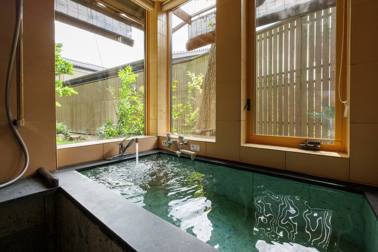 ホテルの正門をくぐると、水盤の細やかな音がお出迎え。客室は、和室にモダンな家具が配置された群青色の壁の月の部屋、朱色の壁の雲の部屋の2タイプ。どちらもプライベートな庭園を眺めながらゆっくりと個室の温泉を堪能できます。