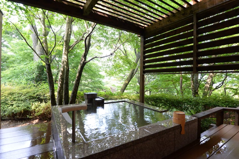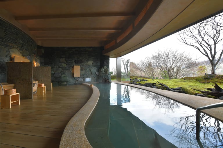 浴室内には自然石や伊豆石を贅沢に使用し、苔庭を配した日本庭園と箱根連山の絶景を一望。豊かな自然とともに至福の湯浴みを。
