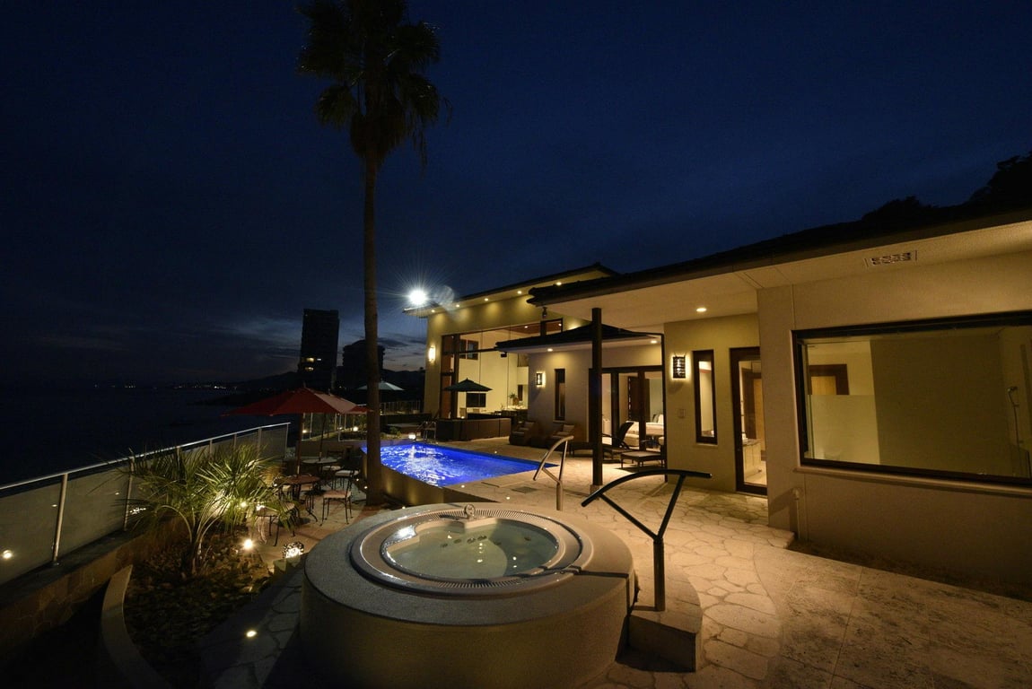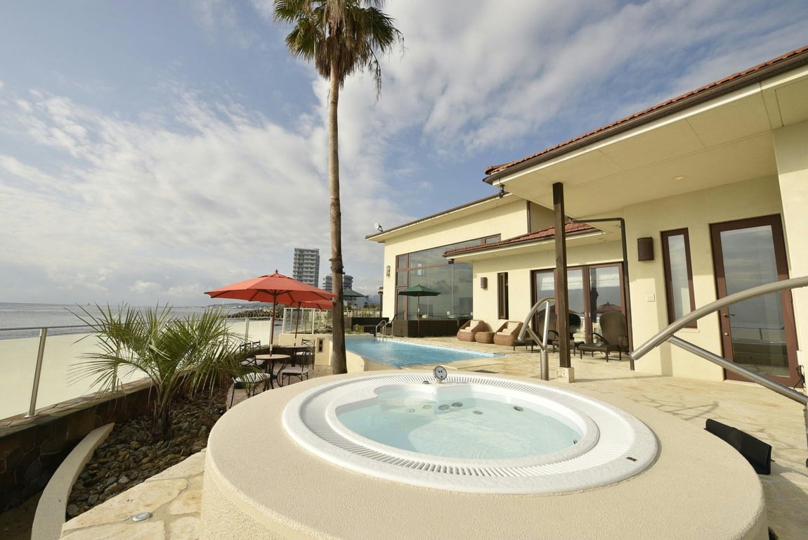 海に面した静かな場所に建つ、敷地総面積1336㎡の広大な一棟貸切貸別荘。