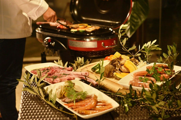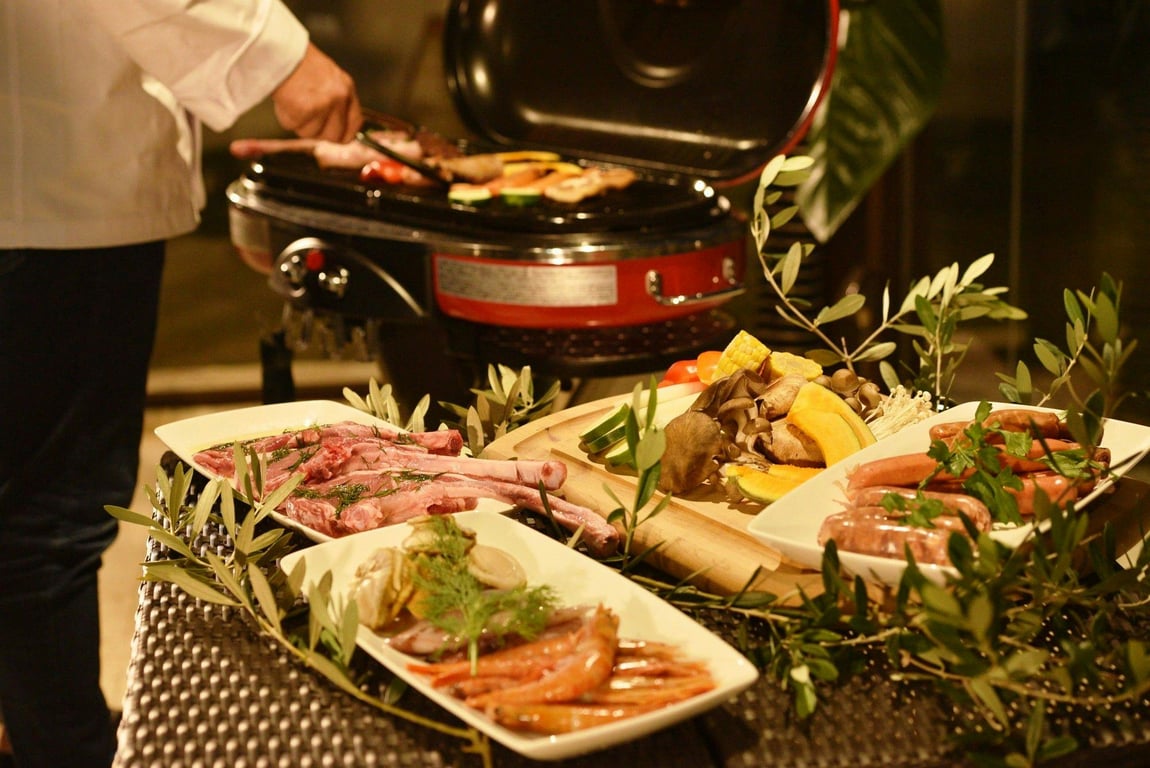 食事は、食材を自由に持ち込んで、テラスでBBQ。