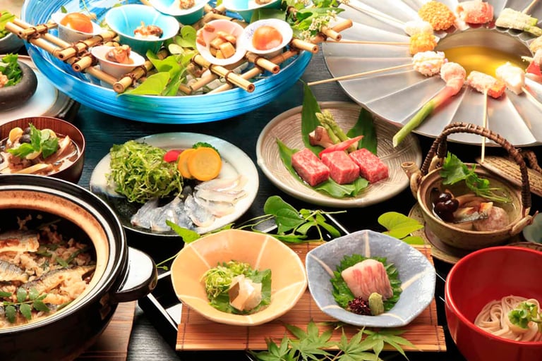 夕食は、伝統と斬新さの融合が堪能できる会席料理🍽 近隣の採れたての食材をふんだんに使用した、滋味あふれる季節替りの料理を堪能。土地に伝わる調理法を取り入れながら、料理長が丁寧に仕立て上げます。