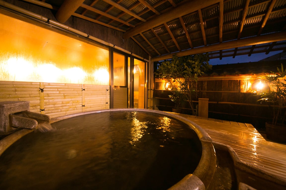 地下1200mから湧き出る「神代の湯」。飛騨高山の温泉旅館のなかでも数少ない自家源泉。静かな庭園に溶け込むような露天風呂で、美容液のような湯に浸れば、心身共に癒されます。