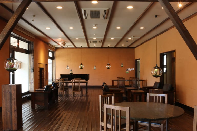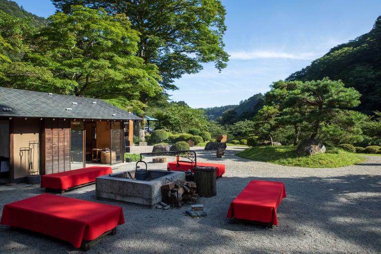 サロン前の庭園喫茶”水琴亭”は、緑豊かな自然に囲まれながらお茶やスイーツ、軽食をいただくことも可能🍵 日常ではあまり目にしない囲炉裏もあり、古き良き和の雰囲気に包まれます。