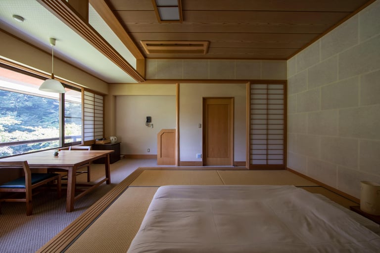 梅の館は、1階客室からは川の向こう側にある自然と庭、2階からは借景の山々が眺められ、川のせせらぎがわずかに聞こえる静かな館。木造建築の松の館は、自然素材を多用し、現代風にリノベーションされた部屋が。2階和室からは水琴亭の庭と山々を眺望。竹の館は、現代アートが飾られた庭園に面しています。