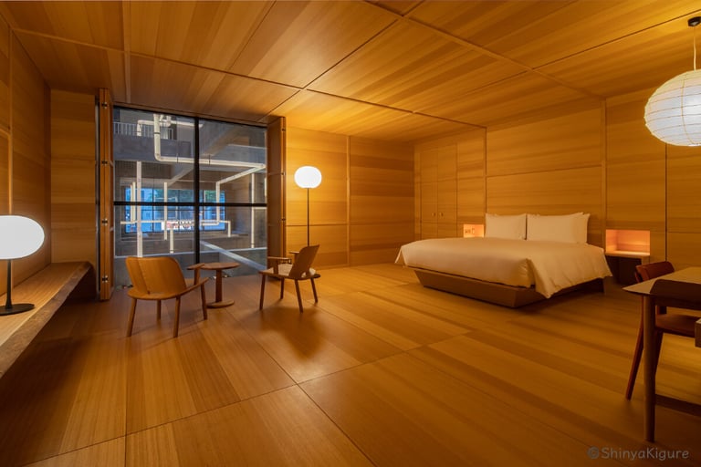 英国代表するデザイナーのジャスパー・モリソン氏がデザインした木の箱のような空間の部屋をはじめ、イタリアの巨匠建築家ミケーレ・デ・ルッキ氏の「板葺き(日本家屋の屋根にも使われる)」を用いた部屋。