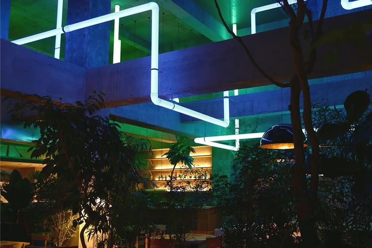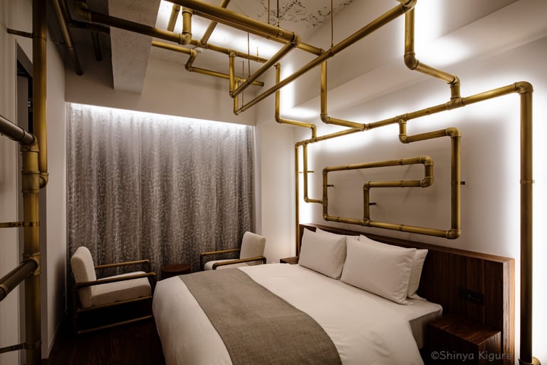 4階建ての建物の床が全て吹き抜けになっており、そこを元々あった旅館の部屋から伸びる配管をイメージさせた「ライティング・パイプ」が四方八方に張り巡らされる姿は圧巻。夜になるとパイプの色が変化して幻想的な光を放ち、まるでホテル自体が作品のように。