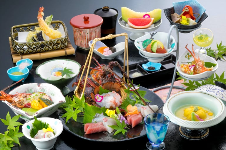 夕食は、伊勢海老、鮑、松阪牛など、地元の食材をふんだんに使った日本料理🍽伊勢海老や松阪牛を堪能できる会席や松坂牛すき焼きを味わえる部屋食を選択することも可能。