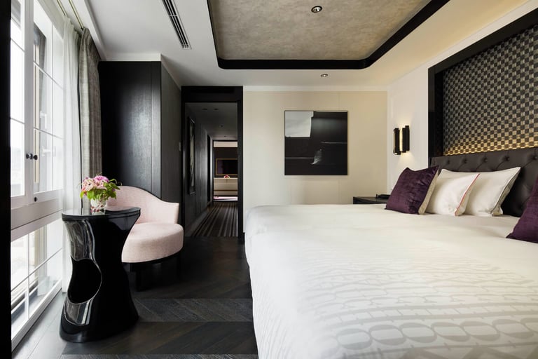 フォションピンクをアクセントにした客室は、京都のアート作品に囲まれ、日本を代表する着物デザイナー斎藤上太郎氏が手掛けたベッドボード、京都の景色を切り取ったフォトグラフアート、日本の伝統工芸を用いたホテルオリジナルのファブリックなど、こだわりがすごい。