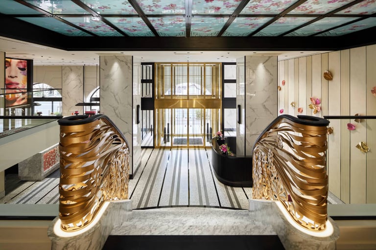 満開に咲き誇る桜をモチーフにしたステンドグラスや、京都の伝統工芸"西陣織"を使用したフォションピンクのソファが置かれたエントランスロビーは、パリのラグジュアリーな雰囲気でありながら和を感じられる空間。