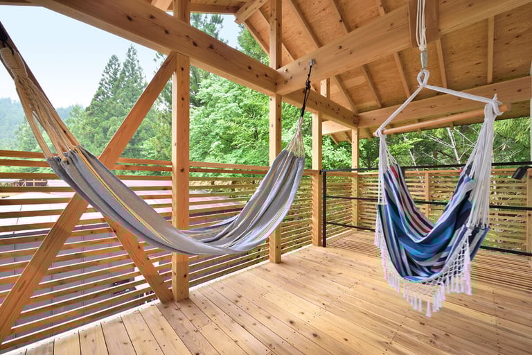 展望テラスにはプライベートバーベキューが楽しめる焼台があり、屋根付きなので雨の日も安心。夜は、ハンモックに揺られながら星空を眺めることも。