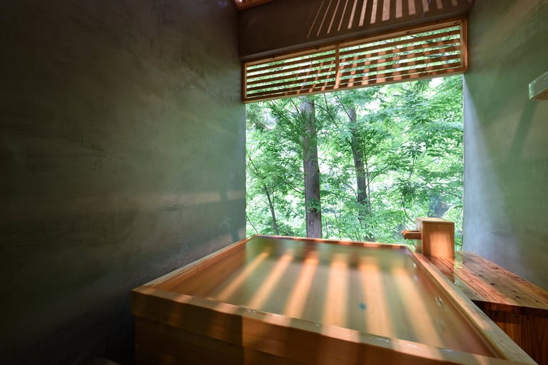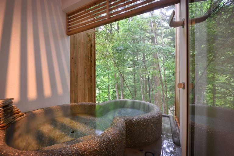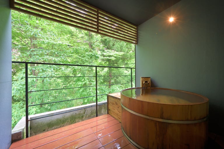 四万川の流れる楓仙峡(ふうせんきょう)に面した客室露天風呂は、疲労回復や美肌効果の高い、四万を代表する"山鳥の湯"と、奥四万ダムの上流に湧く"湯の泉"の2つの源泉をブレンド。檜風呂やモルタルの湯船など、お部屋によって異なるタイプの温泉が楽しめます。