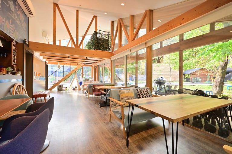 明るい光が差し込むガラス張りのフロント&カフェ棟は、吹き抜けの開放的な空間。日帰りバーベキューができるテラスやカフェスペースがあり、2階席ではシマブルー全体を見渡せます。