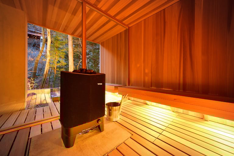 敷地内には本格的なロウリュウサウナもあり、貸切で利用可能。四万川のせせらぎを聞きながら、贅沢なサウナ体験を。
