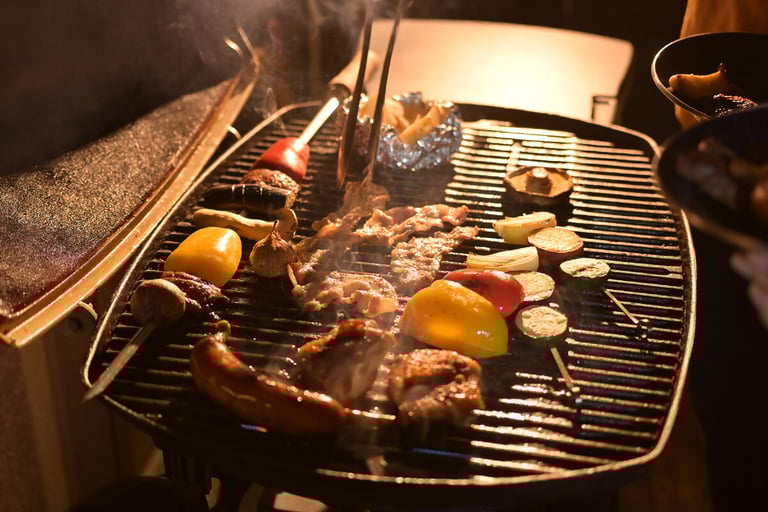 地元群馬の食材がいただける夕食は、ブランド肉"上州牛"のカルビ、上州地鶏、希少部位肉と群馬野菜のBBQ串、マシュマロとビスケットのスモアセットなど、質・量にこだわった自慢のバーベキュー🍽上州牛の特上サーロインやフィレを追加注文することも可能です。