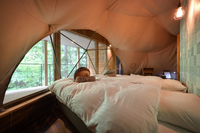 日本初の全室源泉掛け流し露天風呂付きのグランピング施設。
