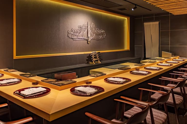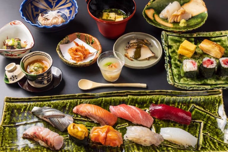 近海の相模湾や駿河湾を中心に、北海道から長崎・五島列島まで全国から厳選した旬の魚介類を仕入れ、お客様に合わせた肴と寿しを提供。一つ一つ目の前で握られる艶やかな寿司を、心ゆくまで味わえます。