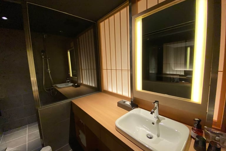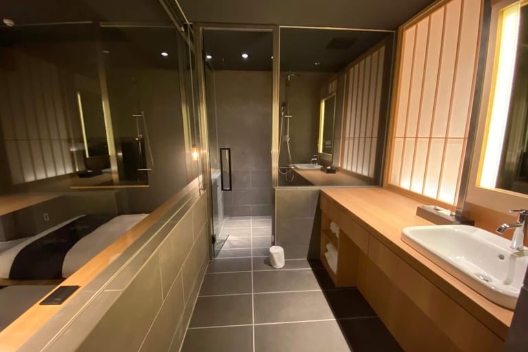 スーペリアツインやスタンダードダブルの部屋は、スタイリッシュな和モダンの設え。シックで落ち着いた浴室では湯本温泉のなめらかな肌触りの湯を堪能。神経痛や筋肉痛にも効果的で、日々の疲れた身体を癒します。