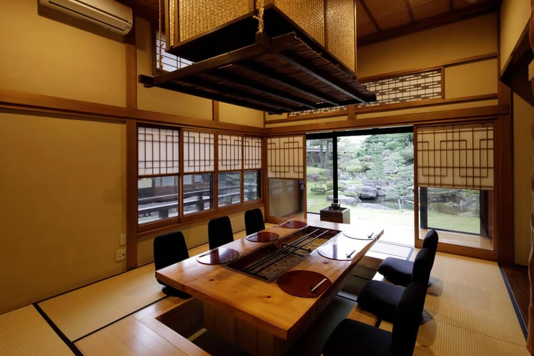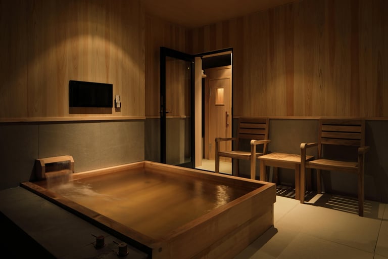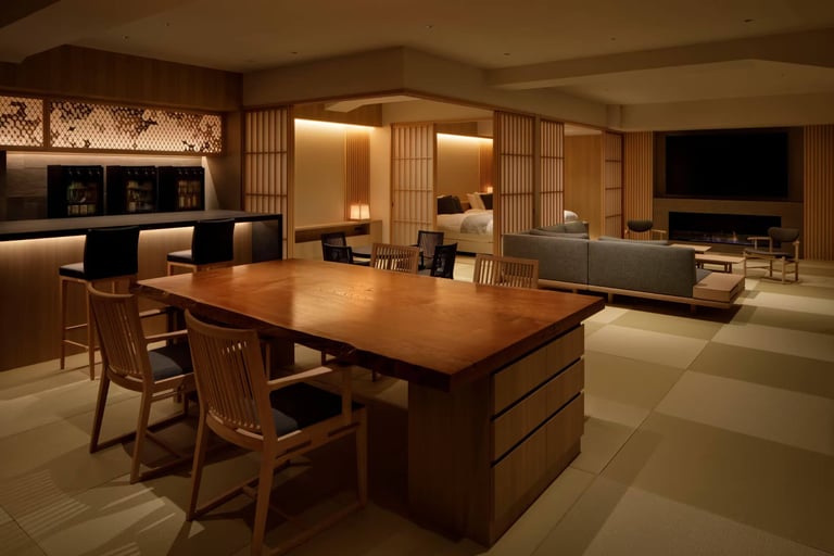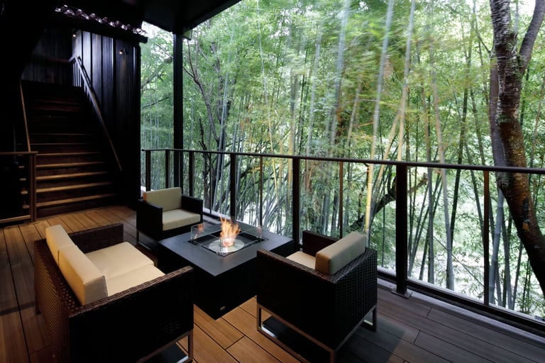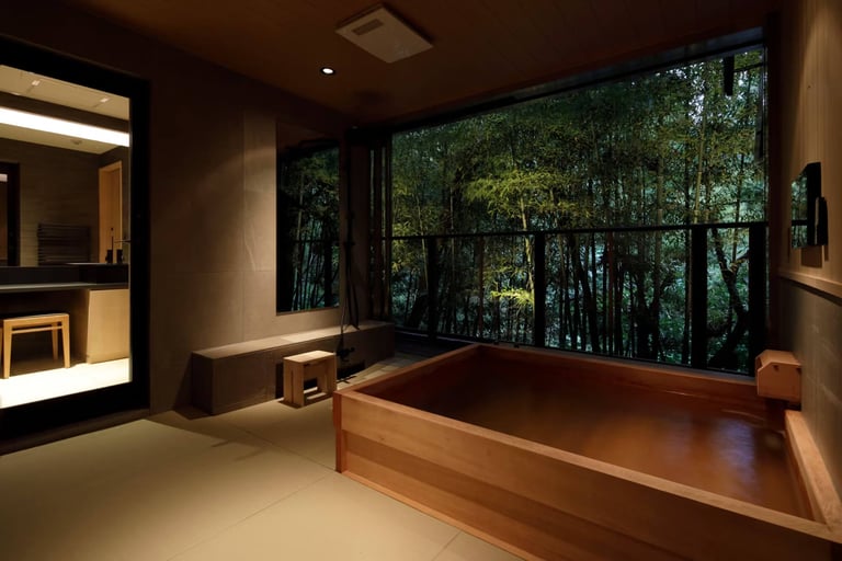 専属バトラーがおもてなしする奥行きある客室は、169平米の広さがある贅沢さ。緑豊かな竹林と川のせせらぎに包まれ、会津の自然を感じられます。窓を開ければ半露天風呂が楽しめる檜風呂やサウナ、暖炉テーブルの炎がゆらぐテラスもあり、静寂の中で心安らぐひと時を。