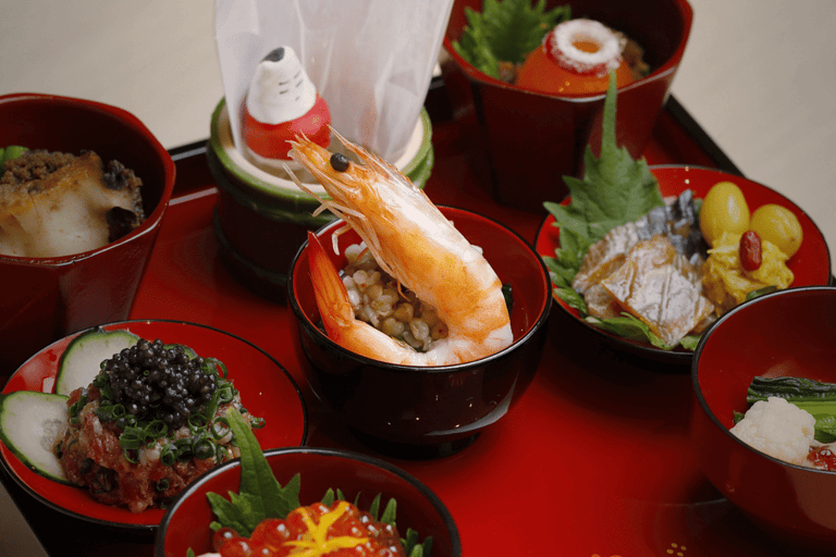 会津塗漆器に盛り付けられた彩り豊かな品々は、上品な赤身のある会津ブランド馬肉や干し貝柱を出汁にしたこづゆ、にしんの山椒漬け、天ぷら饅頭など会津の郷土料理が味わえます。