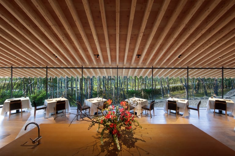 自然の大パノラマが広がる「restaurant」での食事は、その日の朝に採れた那須の食材と料理に合うワインを🍽️ 新進気鋭のシェフが仕立てるフレンチコースは、新しい食体験をお届け。野菜のカタチやサイズにまでこだわり、食材を大切にした逸品が並びます。