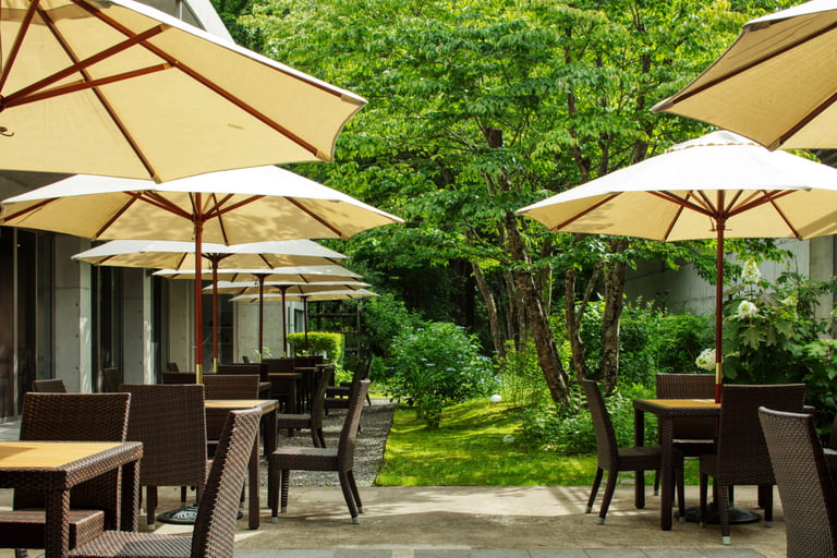 那須の自然を感じられる「cafe terrace」は、とちぎ和牛を使用したランチタイム数量限定の自家製ビーフカレーやパスタが味わえ、コーヒーやアルコールなどはテイクアウト可能。