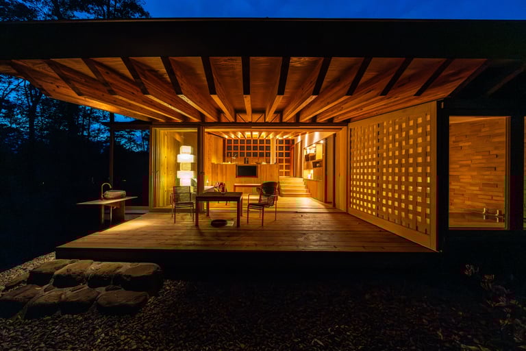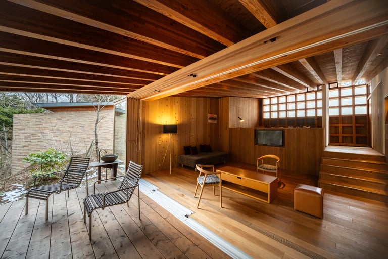 木の温もりを感じられるヴィラは半露天風呂が備わり、無垢材を使用した自然と調和する空間。広々としたテラスでは爽やかな風に包まれながらゆったりとした時間が過ごせ、非日常気分。1棟ごとに異なる四季折々の景色が楽しめ、心からリラックスできるひと時を。