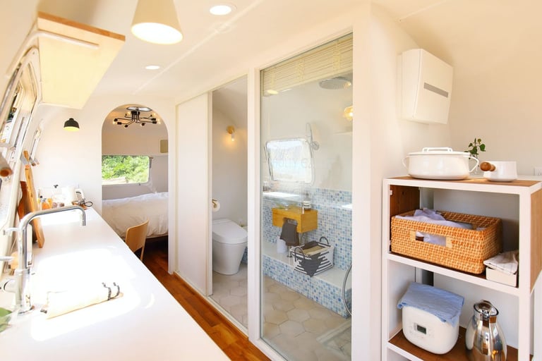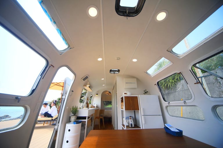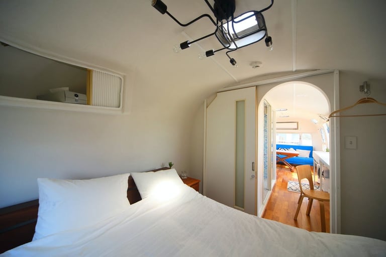 宇宙船のようなフォルムのヴィンテージキャンピングトレーラーは、白を基調としたトレーラーとは思えないホテルのような空間。