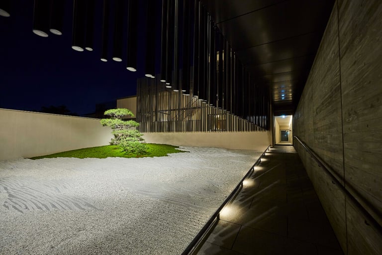 ロビーに面した”白の庭”には、白く輝く川面の岸に黒松が佇み、桂川の流れ・小倉山、嵐山の植生を再現した客室に面した”黒の庭”、レストランと一体になったテラスのある”奥庭”が。