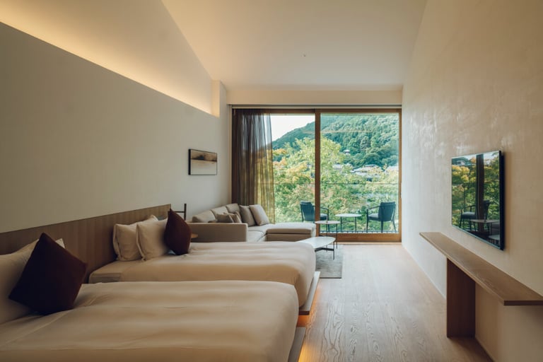 全21室の客室は、嵐山の自然と優しい色調が調和したラグジュアリールーム仕様。