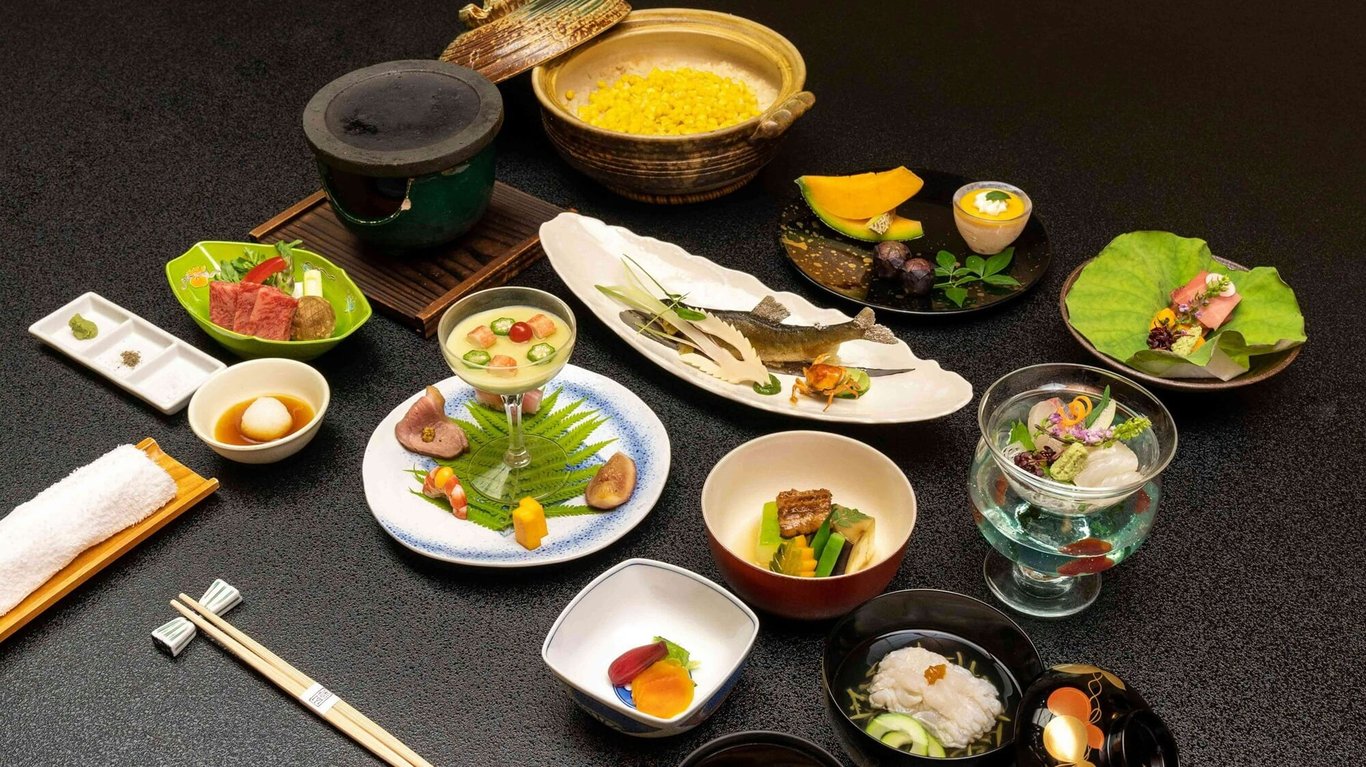 食事は、日本全国から選りすぐった旬の食材を活かした会席料理。