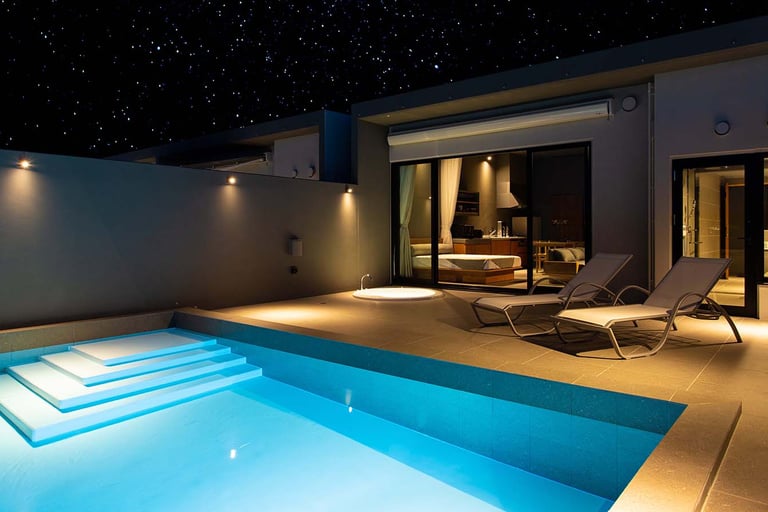 プールは弱温水タイプなので年中楽しめ、夜は満天の星空を独り占めできる贅沢さ。
